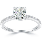 A beautiful, classic dainty ring fit for your lady love. The focal point is a modest 1.05ct cushion cut diamond with an E color and SI1 clarity lavishly extending into the band is an additional 0.40ct of round brilliant diamond accents with a F color and VS clarity in a 18k white gold Micro Pave setting. This dreamy ring will be the beginning of your "I do."