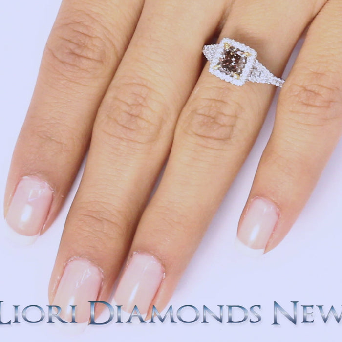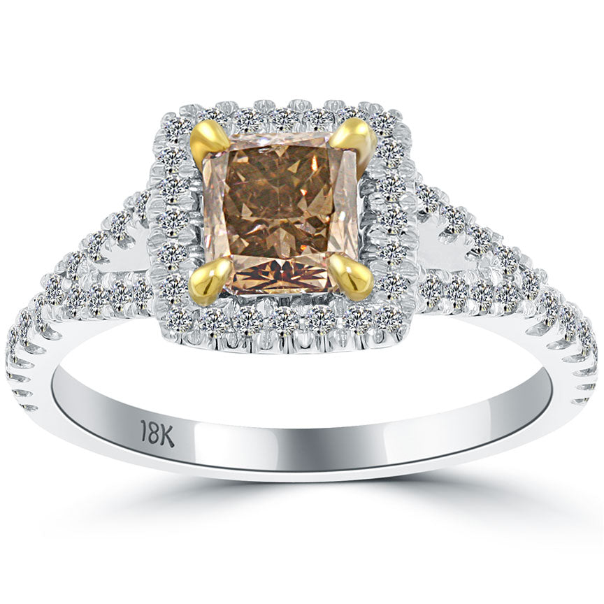 1.45 Carat Fancy Cognac Brown Radiant Cut Diamond Engagement Ring 18k Pave Halo