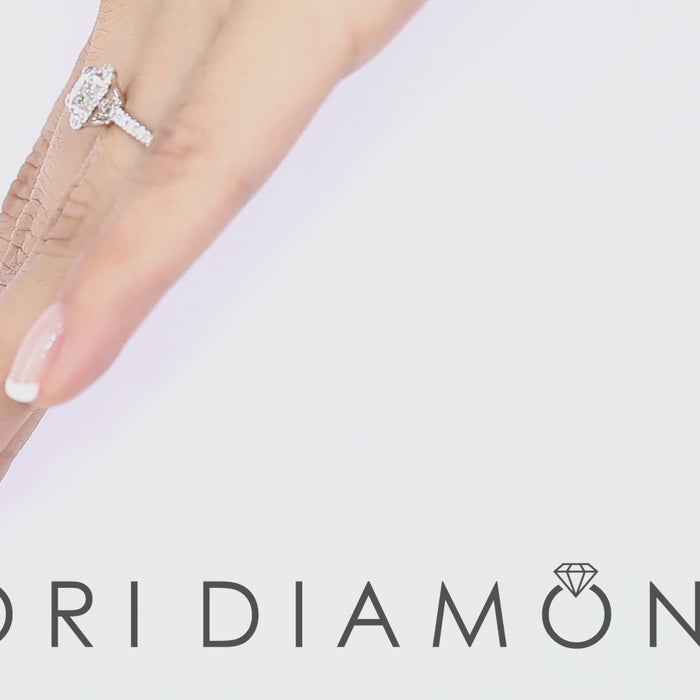 Take her breath away when you propose with this vintage inspired cushion cut diamond engagement ring. Traditional elegance is found in the 1.00 cushion cut center diamond, which is G in color and VS2 in clarity. Four strong prongs guard and secure the beautiful center stone. All of the accent stones are round brilliant diamonds, which glimmer constantly in the micro pave setting. Creating a halo around the gorgeous cushion cut diamond and extending halfway down the band, the side diamonds provide constant sparkle. This classic and vibrant engagement ring is set in 14k white gold.