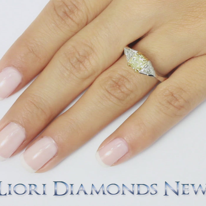 This gorgeous Diamond Engagement Ring is a traditional three stone ring but with a little edge and modern touch. This ring consists of a 0.76 ctw Cushion Cut, Fancy Yellow center diamond and two 0.70 ctw trillion cut, white diamonds on either side. The white gold band is smooth and solid all the way around. The center diamond is slightly raised above the two side stones, to stand out more and give more diversity. The yellow center diamond is highlighted by a yellow gold base that holds it, and four yellow gold securing prongs. This ring is made in 14kt white and yellow gold.