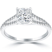 This very classy and elegant diamond engagement ring is beautifully set with a 1.22 ctw cushion cut center diamond. The split shank of the band is lined with 0.25 ctw of round brilliant side diamonds, that are all set in a micro pave setting. This cushion cut diamond engagement ring is made in 18k white gold.