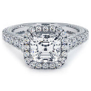 A micropavé halo diamond engagement ring set with 1.50ct dew Asscher Cut VVS & Colorless (D-E-F) Moissanite.