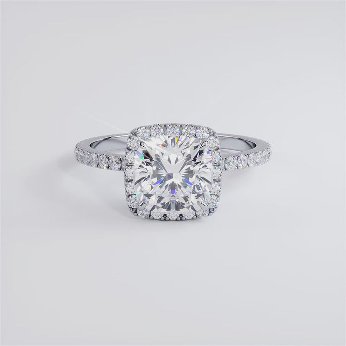 A high set squarish halo engagement ring set with 1.50 Carat Cushion Cut Lab Grown Diamond.