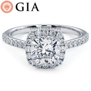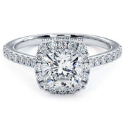 A micropavé halo engagement ring set with 1.50 Carat Cushion Cut Lab Grown Diamond.