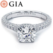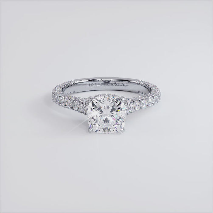 A trio micropavé under halo diamond engagement ring set with 1.50 Carat Cushion Cut Lab Grown Diamond.