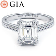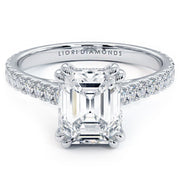 A petite micro prong set diamond engagement ring set with 1.50 Carat Emerald Cut Lab Grown Diamond.