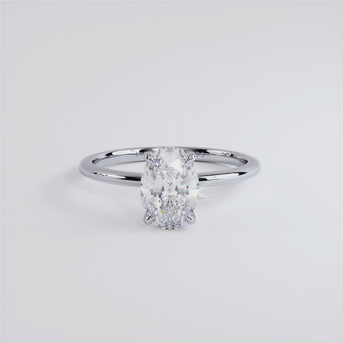 A classic petite wire basket diamond solitaire engagement ring set with 1.50 Carat Oval Cut Lab Grown Diamond.