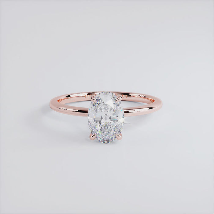 A classic petite wire basket diamond solitaire engagement ring set with 1.50 Carat Oval Cut Lab Grown Diamond.