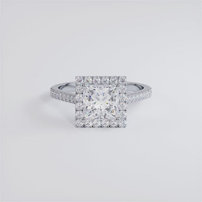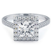 A square micropave halo diamond engagement ring set with 1.50ct dew Princess Cut VVS & Colorless (D-E-F) Moissanite.