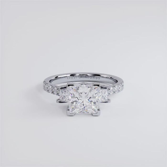 A three stone micropavé diamond engagement ring set with 1.50ct DEW Princess Cut Charles & Colvard Forever One™ Colorless (D-E-F) Moissanite.