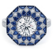 Hand made art deco special cut sapphire & diamond engagement ring set with 1.50ct DEW Round Cut Charles & Colvard Forever One™ Colorless (D-E-F) Moissanite.