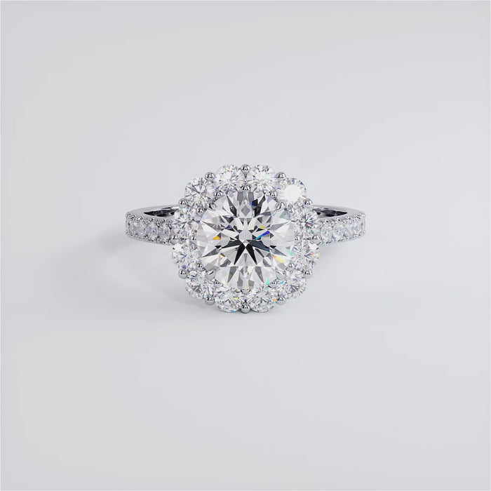 A unique floral halo diamond engagement ring set with 1.50 Carat Round Cut Lab Grown Diamond.