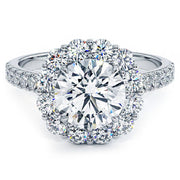 A unique floral halo diamond engagement ring set with 1.50ct dew Round cut VVS & Colorless (D-E-F) Moissanite.