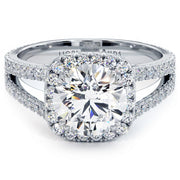 A halo split shank french cut diamond engagement ring set with 1.50ct dew Round Cut VVS & Colorless (D-E-F) Moissanite.