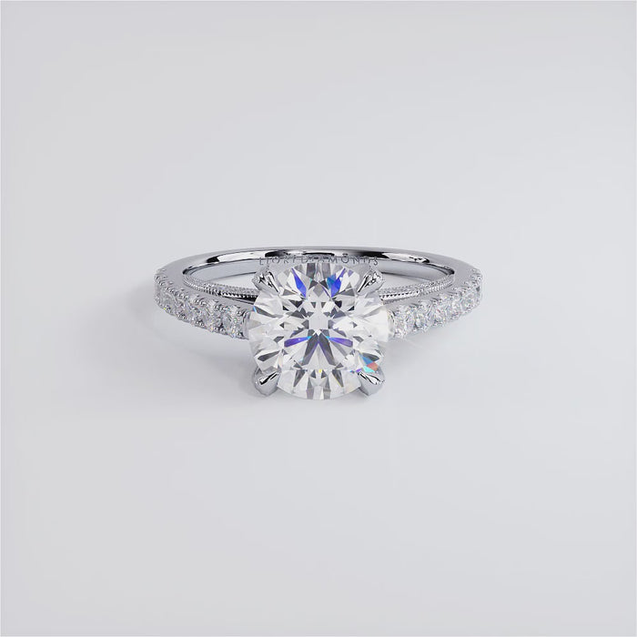 A micropavé milgrain prongs diamond engagement ring set with 1.50ct dew Round Cut VVS & Colorless (D-E-F) Moissanite.