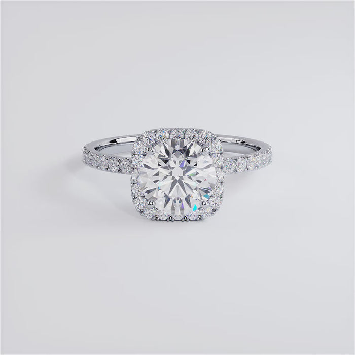 A petite squarish halo micropavé diamond engagement ring set with 1.50 Carat Round Cut Lab Grown Diamond.