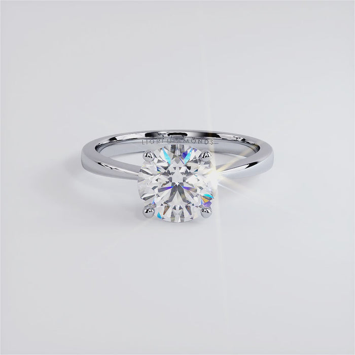 A petite tapered 4 prong solitaire engagement ring set with 1.50 Carat Round Cut Lab Grown Diamond.