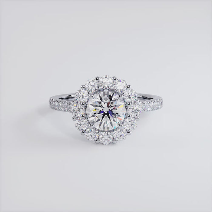 A unique XL floral halo diamond engagement ring set with 1.50ct dew Round cut VVS & Colorless (D-E-F) Moissanite.