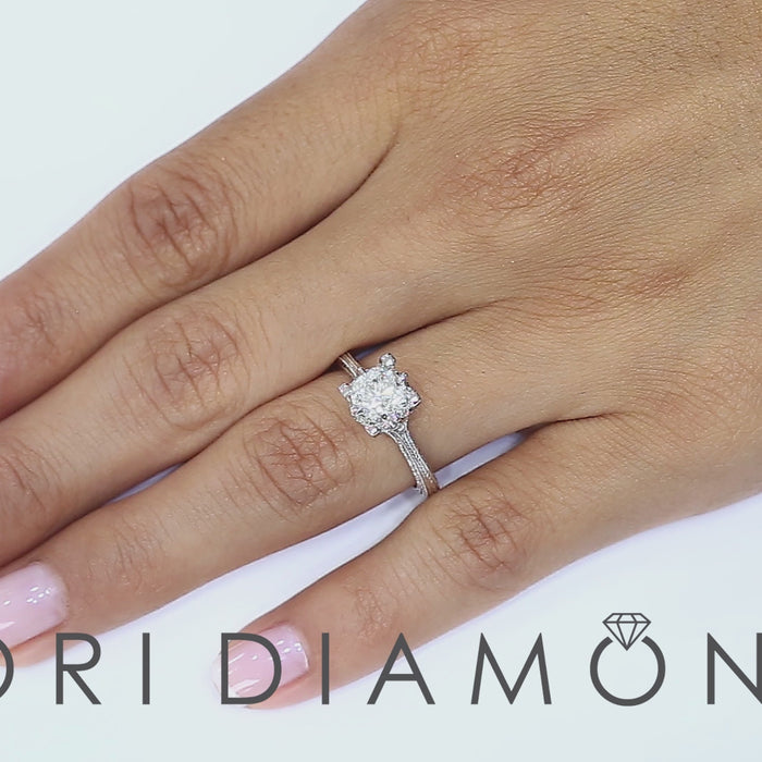 This magnificent vintage style diamond engagement ring is sure to please your future bride! A mesmerizing 1.30 ctw round brilliant diamond sparkles from the center. The captivating center diamond is D in color (which is colorless), SI2 in clarity, and is held in place by 4 securing prongs. The over-sized corners of the basket create an interesting look, as do the alternating small round diamonds set in between the prongs. Crafted entirely in 18k white gold with an art deco design engraved into the band, this diamond engagement ring makes a beautiful statement.