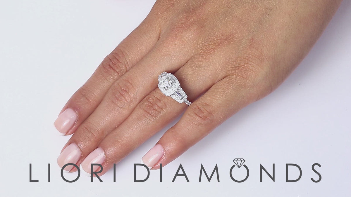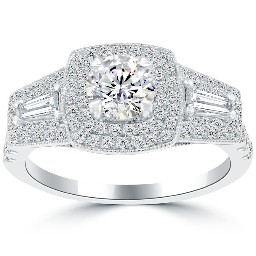 Beautifully designed to accentuate the center diamond, the engagement setting consists of 0.71 ctw round & baguette cut diamonds. The 0.79 ctw round brilliant center diamond is perfectly secured with four prongs. Graded SI-I, no visible inclusions are noted by the naked eye. With a uniquely crafted base, the engagement ring is left with a fortunate look. The hand-crafted piece is made in 14k white gold.
