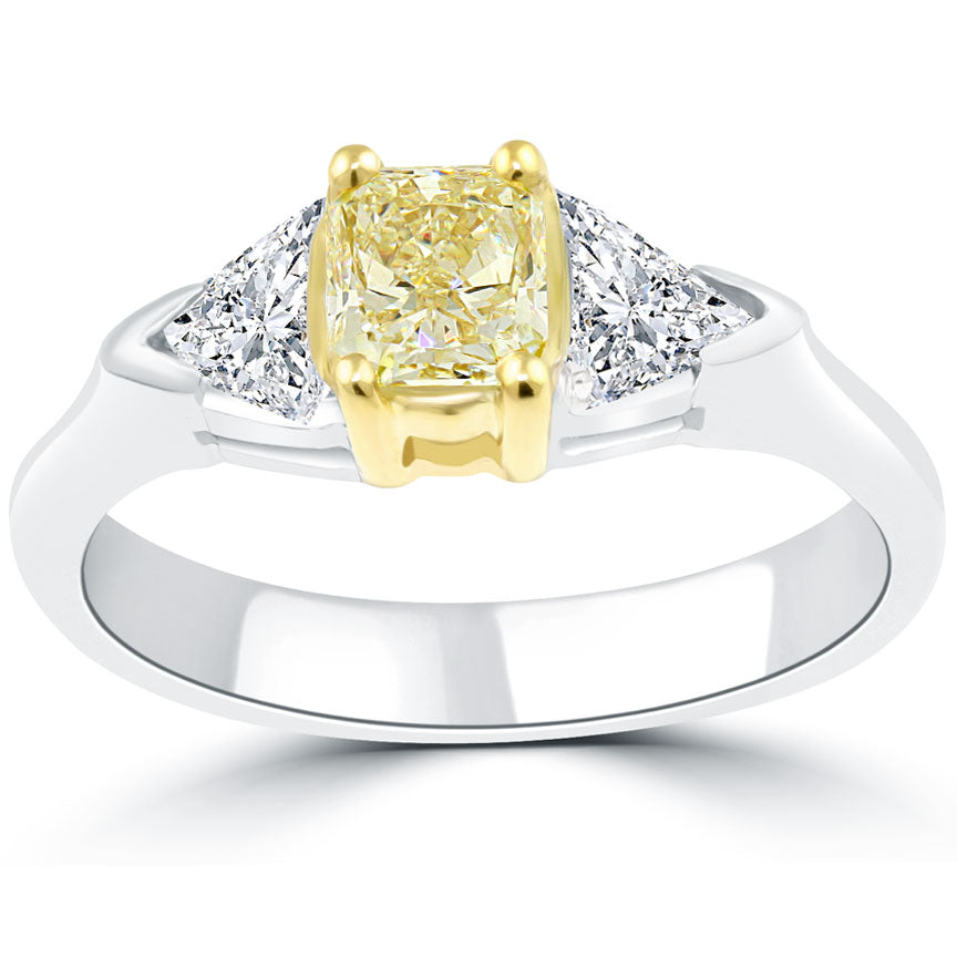 This gorgeous Diamond Engagement Ring is a traditional three stone ring but with a little edge and modern touch. This ring consists of a 0.76 ctw Cushion Cut, Fancy Yellow center diamond and two 0.75 ctw trillion cut, white diamonds on either side. The white gold band is smooth and solid all the way around. The center diamond is slightly raised above the two side stones, to stand out more and give more diversity. The yellow center diamond is highlighted by a yellow gold base that holds it, and four yellow gold securing prongs. This ring is made in 14kt white and yellow gold.