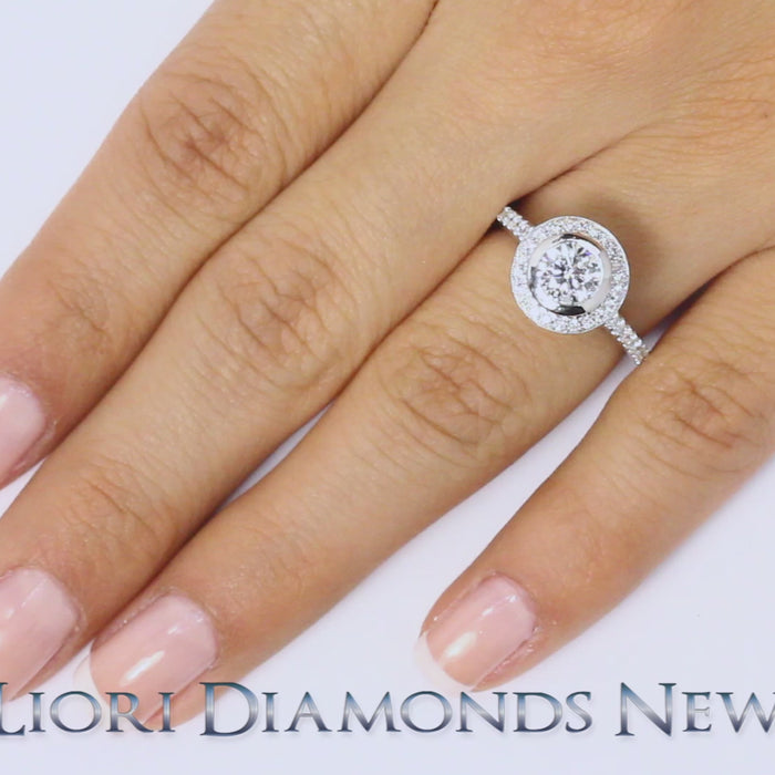 This beautiful diamond ring holds a 0.96ctw round brilliant center diamond. 0.55ctw of brilliant round diamonds are used for the side stones of this ring.The center stone is set in a bezel setting. A diamond halo surrounds the center stone. On either side of the center diamond, one row of diamonds lines up the band going half way down the ring. The surfaces of the ring have round diamonds set in the as well. All of the side diamonds are secured in a micro pave setting. This ring is made in 18kt White Gold.