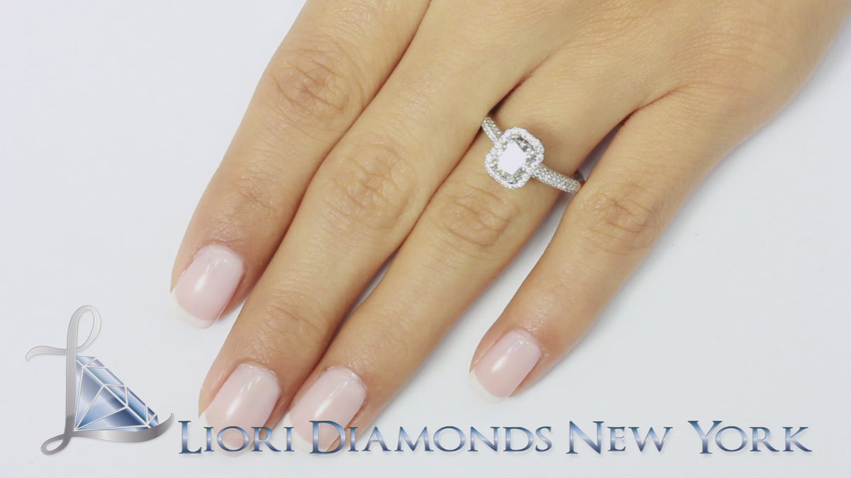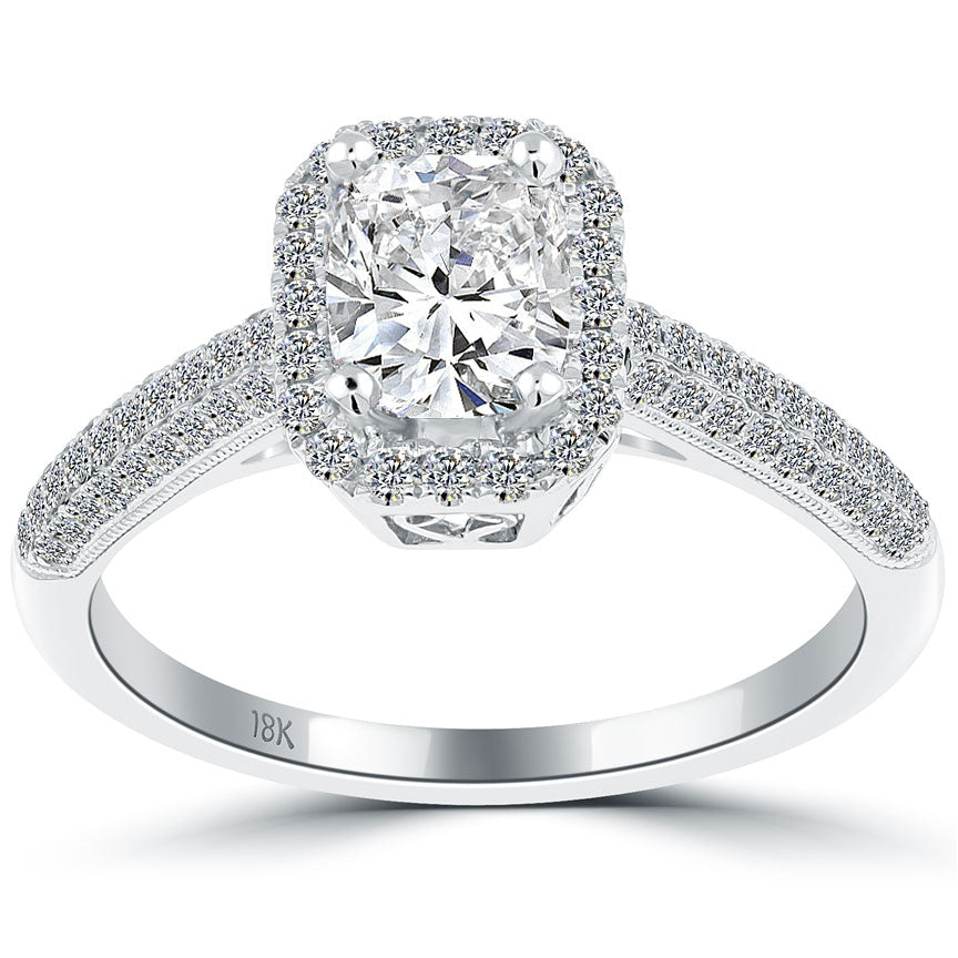 This sensational diamond ring holds a 1.01ctw G-SI1 Cushion Cut center diamond. The side stones are all F-VS round brilliant diamonds. A halo of round diamonds surrounds the center stone set with a micro pave setting. Three rows of round diamonds are set along either side of the band, going half way down the ring. The center stone is secured by a prong setting. Beneath the center stone, vintage designs are carved into the white gold basket of the ring. This ring is made in 18kt White Gold.