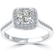 This sparkly diamond engagement ring is perfectly set up with a 1.02 ctw white radiant cut center diamond and 0.52 ctw of gorgeous round brilliant side diamonds. The gorgeous radiant cut center diamond is surrounded by a sparkly pave halo of round brilliant diamonds. More round diamonds are elegantly set along the band of the ring, in a micro pave setting. This radiant cut diamond engagement ring is made in 18k white gold.