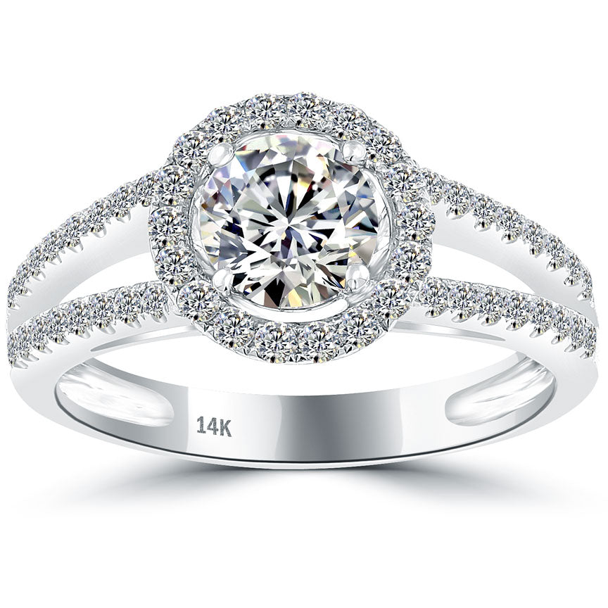 1.54 Carat F-SI2 Natural Round Diamond Engagement Ring 14k White Gold Pave Halo