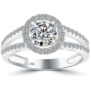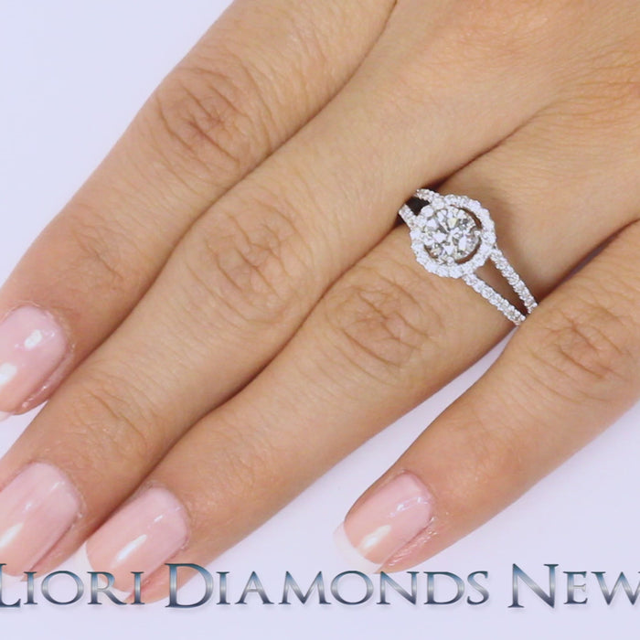 This classy Diamond Engagement Ring holds a 0.92 ctw Round Brilliant center diamond. The split shank and pave halo detailing are all set with round brilliant side diamonds. The center diamond is set low and is secured by the four surrounding prongs. This ring is made in 18kt White Gold.