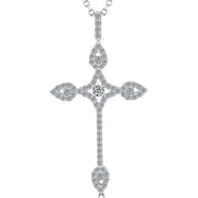 This fascinating diamond pendant is set with 1.55ctw of F-VS round brilliant diamonds that are beautifully set to form a lustrous diamond cross. Each diamond dazzles and sparkles from every angle. All of the diamonds are set and secured in a micro pave setting to create a unique art deco style design. This diamond cross pendant necklace is set in 14k white gold and comes with a matching white gold chain.
