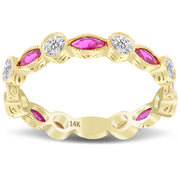 This beautiful wedding band anniversary ring is elegantly set with 1.55ctw of white round brilliant white diamonds and marquise cut genuine ruby stones. All of the stones are secured in a bezel setting and are set along the vintage styled band. This stunning anniversary ring is made in 14k yellow gold.