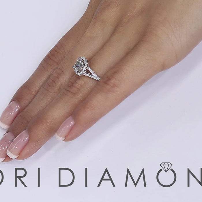 This fascinating diamond ring is set with a 1.24 ctw G-SI1 Cushion Cut center diamond. This ring is accompanied by 0.33cts TW round side diamonds. The small round diamonds surround the center stone in a single row. The band has a slight split shank that forms a V on either side of the center stone. Round diamonds are set on either side of the band, along the V and going down in a single row half way down the ring. This ring is made in 14kt white gold.