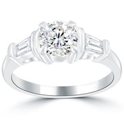 A brilliant round diamond is properly set in a modern chic setting. The 1.20 ctw F-SI1 center diamond is finely secured by 4 prongs. An F color, VS baguette diamond is set horizontally on each side of the sparkling main diamond. This simple and elegant diamond engagement ring is set in 14k white gold.