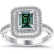 This vintage style diamond engagement ring is set with a stunning 1.11ct TW greenish blue emerald cut diamond center stone. This unique vintage style ring is made out of 14kt white gold. This engagement ring is set with 0.52ctw of beautiful round cut side diamonds.