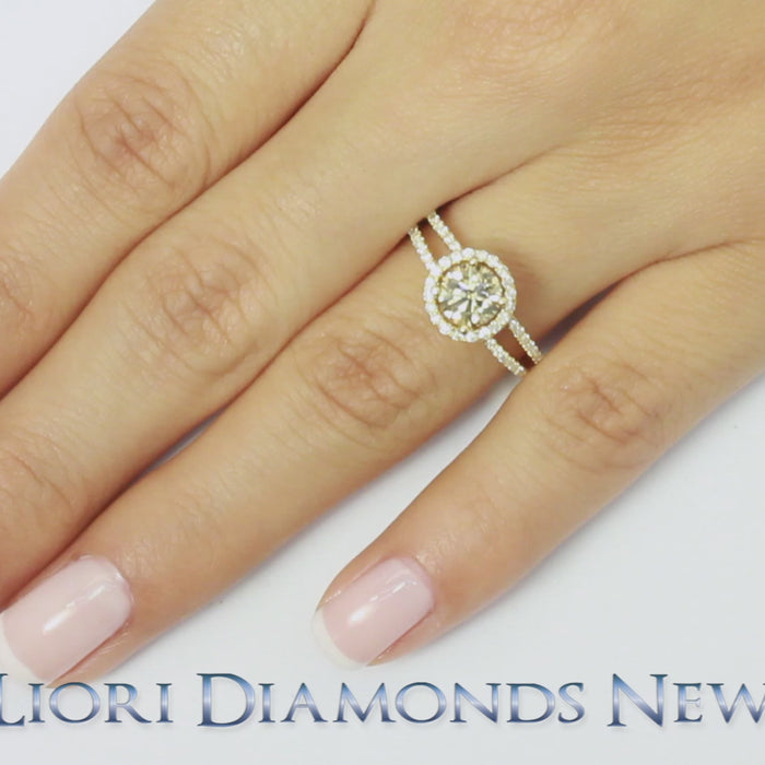 This ravishing fancy color diamond engagement ring holds a 0.98 ctw Fancy Champagne round brilliant center diamond. 0.65 ctw of F-VS white round brilliant side diamonds are set along the split shank band of the ring, and surround the center diamond in a pave halo design. The center diamond is secured in a prong setting and all of the side diamonds are set in a micro pave setting. This fancy color diamond engagement ring is made in 14k yellow gold.