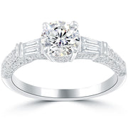 This classic diamond engagement ring holds a 1.00 ctw round brilliant center diamond with two baguette diamonds set horizontally to each side. The sparkly center diamond is E in color, SI2 in clarity, and secured by 4 sturdy prongs. 0.65 ctw of glittering micro pave set round diamonds elegantly line the band on three sides. Cast in 14k white gold, this sophisticated diamond engagement ring is sure to be a gift that will be cherished for a lifetime.