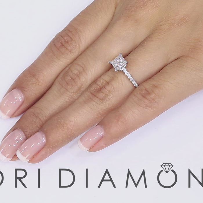 Here is a beautiful engagement ring centered with a flawless 1.29ctw Princess cut diamond. Properly secured by four sturdy prongs the diamond sits slightly elevated on a 18k white gold setting. The sparkly micro-pave mount is gorgeously decorated with 0.36ctw Round brilliant diamonds giving it a unique touch. Simple and elegant the princess cut engagement ring is perfect for the one seeking a demure style.