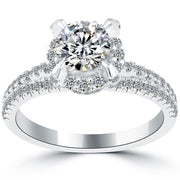 This unique diamond engagement ring is perfectly set up with a 1.01ctw white round diamond center stone and 0.65ctw of gorgeous sides stones. This elegant diamond engagement ring is complimented by a halo of diamonds which compliments the center diamond quite well. This unique diamond engagement ring is casted in 18kt white gold.