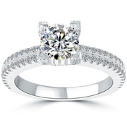 This beautiful and traditional diamond engagement ring is truly elegant. This classy engagement ring is set with a 1.12ctw round brilliant center diamond and 0.55ctw of F-VS round brilliant side diamonds. The center diamond is secured in a prong setting and all of the side diamonds are set in a micro pave setting. This is the ultimate ring for your modest and elegant bride and it is made in 18k white gold.