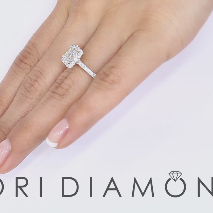 This alluring diamond engagement ring will surely put a big smile on the face of your future bride! A dazzling princess cut diamond totaling 1.02 ctw sparkles from the center. The sensational center diamond is E in color and VS2 in clarity. Vibrant micro pave set round diamonds form a halo around the gorgeous main diamond, and extend onto the elegant band. All of the micro pave set diamonds in this piece total 0.65 ctw, and are F-VS in color and clarity. Pretty and feminine, this amazing engagement ring is beautifully crafted in 14k white gold.