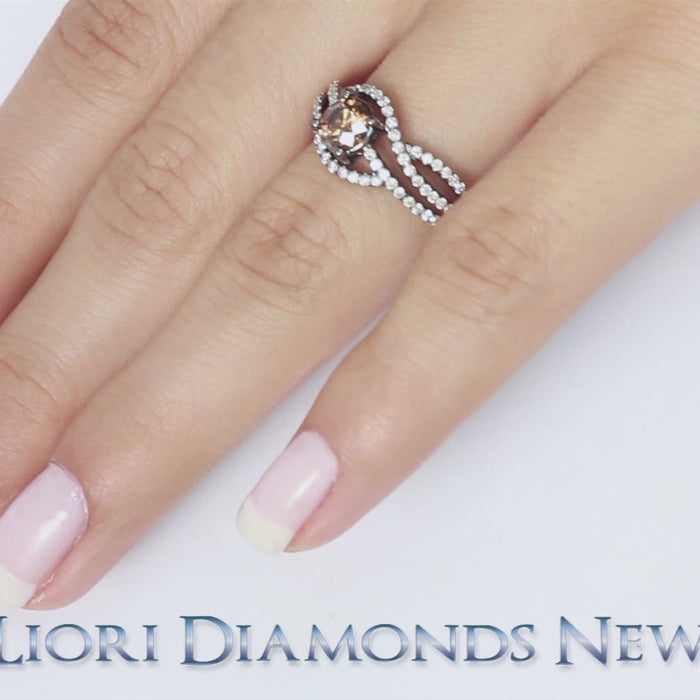 This elegant and unique fancy color diamond engagement ring is beautifully set with a 0.74ctw fancy cognac round brilliant center diamond and 0.94ctw of white F-VS round brilliant side diamonds. White round diamonds are set in a micro pave setting along the band of this ring as well as around the center diamond, in a beautiful vintage style design. This fancy color round diamond engagement ring is made in 14k black gold.