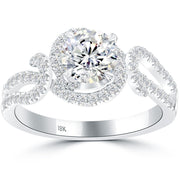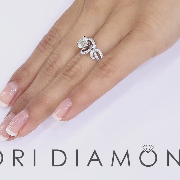 Surprise your special bride to be with this unique vintage style diamond engagement ring. An alluring 1.05 ctw H-SI3 round diamond radiates with brilliance at the center of this piece, and is guarded by four sturdy prongs. Dazzling micro pave diamonds are set around the center diamond and also extend onto the unusual curvy, split shank band. All pave set diamonds total 0.64 ctw, and are F-VS in color and clarity. Crafted in 18k white gold, this engagement ring is ready to make the love of your life very happy!