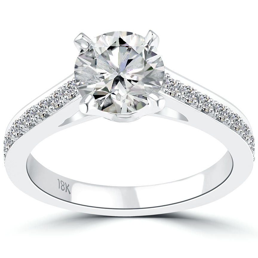 This elegant diamond engagement is set with a 1.50 ctw round brilliant center diamond. The side diamonds used in this engagement ring are all round brilliant diamonds as well. The center round diamond is set in a prong setting and all of the side diamonds are set on the band in a micro pave setting.