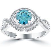 This stunning fancy color diamond engagement holds a beautiful 1.19ctw round brilliant fancy blue center diamond. The side diamonds of this engagement ring are all F-VS white round brilliant diamonds. This vintage style engagement ring is beautifully designed with a pave halo design around the center diamond and a crisscross band that is lined with sparkly white round diamonds. This beautiful diamond engagement ring is made in 18k white gold.