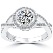 This astonishing diamond ring holds a 1.11 ctw round brilliant center diamond and 0.62 ctw of round side diamonds. The center diamond is secured in a bezel setting. The band of this ring has a criss-cross design that is lined with small round brilliant diamonds. A halo of small round diamonds surrounds the center diamond. All of the side diamonds are secured in a micro pave setting. This engagement ring is made in 18kt White Gold.
