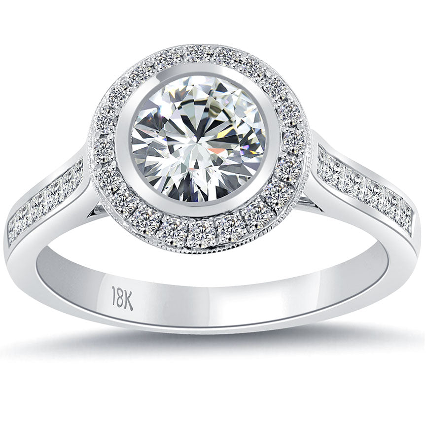 This simple round diamond engagement ring is set with a 1.15ct TW round brilliant diamond center stone. The center stone is a VS2 in clarity round diamond. This ring is perfectly set in 18kt white gold with 0.60cts TW of small side diamonds. This round brilliant center diamond is surrounded by a beautiful diamond halo ring that really enhances it's character.