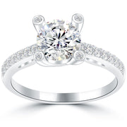 This is a traditional style diamond engagement ring with a unique edge. An enchanting 1.44 ctw round brilliant diamond beams from the center, and is H-SI1 in color and clarity. The main diamond is secured in the setting by 4 sturdy prongs that are each capped with their own diamond on the top. Glittering micro pave set round diamonds are elegantly set on the band, to either side of the beautiful center stone. All vibrant side diamonds are F-VS in color and clarity, and total 0.34 ctw. Luxuriously set in 18k white gold, this ring is sure to be a gift that will be treasured forever.