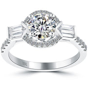 This striking vintage style diamond engagement ring is beautifully set with a gorgeous 1.09 ctw round brilliant center diamond. Smaller round brilliant diamonds are set in a micro pave setting along the band and around the center stone in a halo design. Baguette diamonds are set horizontally on the band, on either side of the round center diamond. This diamond engagement ring is made in 18k white gold.