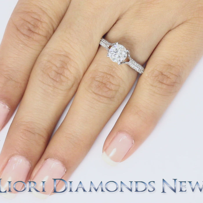 This elegant diamond engagement ring is made with a 1.18 E-SI2 round brilliant center diamond. The center diamond is set high and is secured by four supporting prongs. 0.64 ctw of F-VS round brilliant side diamonds are set along the band and of the ring, as well as the four prongs securing the center diamond. The band of this diamond engagement ring has a slight split shank. This round diamond engagement ring is made in 18k white gold.